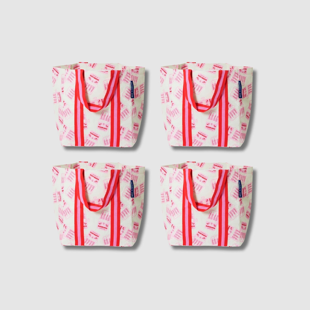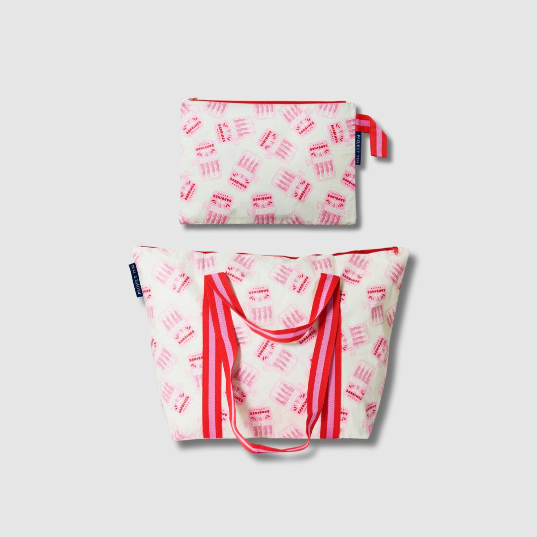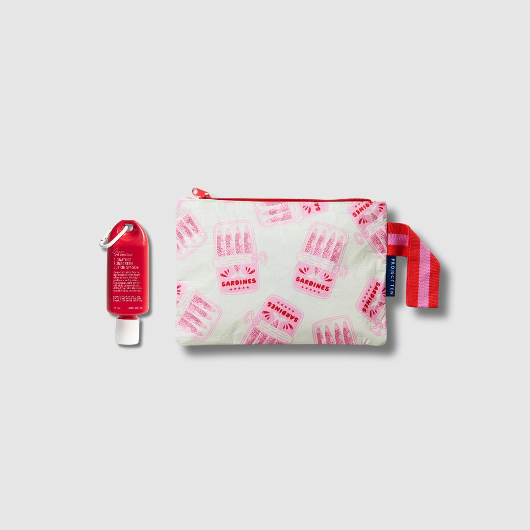 Graphic pink and red sardine cans scattered across a creamy base – playful, quirky and full of personality. A print that sparks a smile, feels fun and adds a cheeky twist to your day.