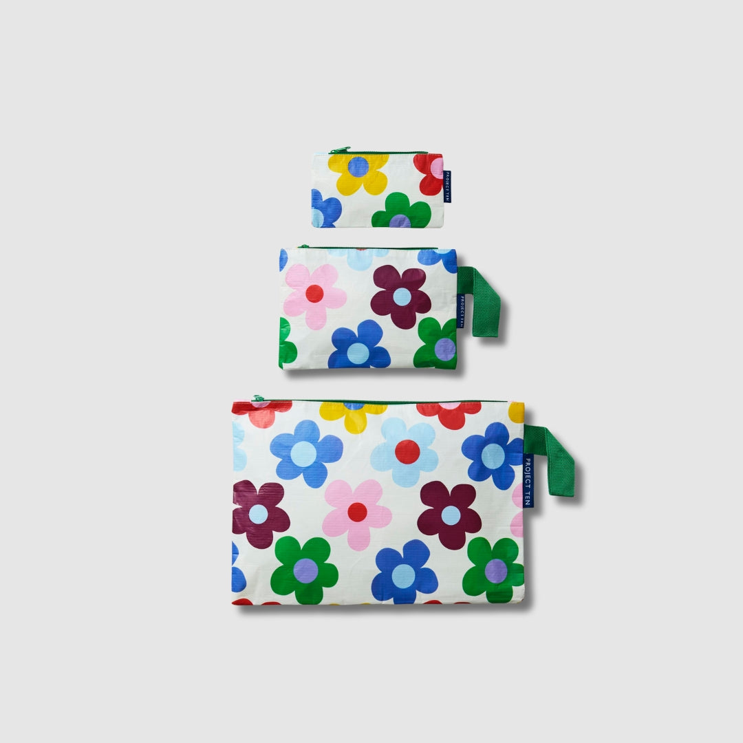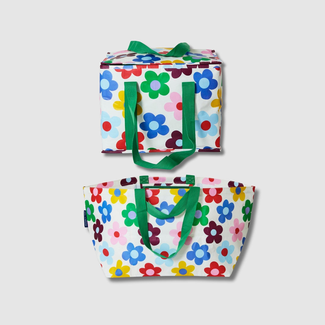 Bright flowers in a bold repeat across a soft cream base – playful, lively and full of feel-good charm. A print that’s a little retro, a little fun and adds a pop of colour to any day.